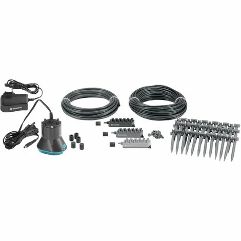 Ensemble de vacances avec réservoir GARDENA modèle 1266 pour arroser automatiquement jusqu’à 36 pots Modèle anagolo à l’art. récipient de 9 litres pour l’eau 1265, mais avec un La pompe, immergée dans un récipient, transporte l’eau vers les distributeurs Les 3 distributeurs, avec des débits différents, permettent la distribution de l’eau à chaque plante à travers les 12 sorties en petites gouttes Le système est activé une fois par jour pendant 1 minute à l’aide d’un transformateur avec minuterie intégrée Support pour la fixation de 3 tuyaux d’égouttage pour chaque cuve Quantité d’eau pour chaque sortie à gauche: distributeur gris clair 15 ml / minute distributeur gris moyen 30 ml / minute distributeur gris foncé 60 ml / minute Transformateur de courant fermé à basse tension (14V) pouvant être utilisé à l’intérieur et à l’extérieur Modèle: 1266-20 Pour l’arrosage automatique jusqu’à 36 cuves Le remplacement idéal pour les vacances