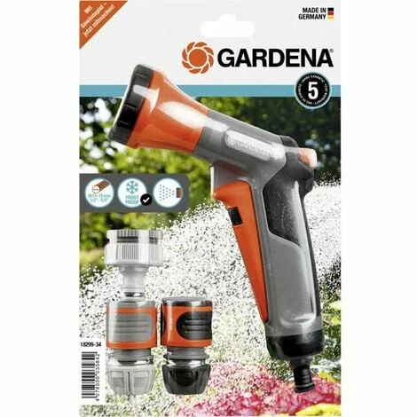 - 1x pomme d’arrosage Comfort, 1x nez de robinet, 1x raccord de tuyau, 1x arrêt d’eau.