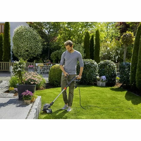 Le coupe-bordures est équipé d’un manche télescopique ajustable en fonction de votre taille et d’une poignée supplémentaire ergonomique, pour vous permettre de travailler confortablement. Il est également doté d’une tête de coupe pivotante à 0, 10 ou 60° (fonction dresse-bordures) pour permettre une coupe verticale et précise des bordures de pelouse.