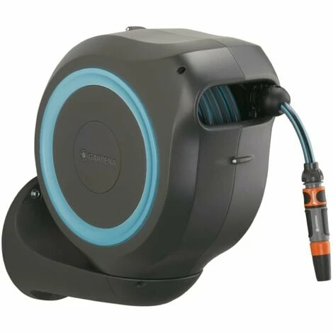 Le dĂ©vidoir automatique et mural est livrĂ© avec un support mural, un tuyau d’arrosage de 15 m, un tuyau de raccordement de 1,5 m, une lance de nettoyage et tous les accessoires nĂ©cessaires pour l’arrosage (OGS GARDENA).