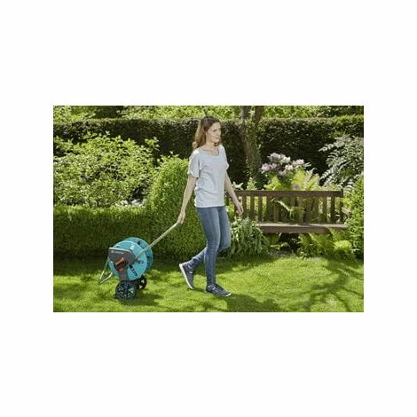 Le dévidoir GARDENA est équipé d’un raccord de tuyau coudé afin de permettre d’enrouler et dérouler le tuyau d’arrosage sans coude ni torsion et ainsi toujours garantir un débit d’eau maximal.