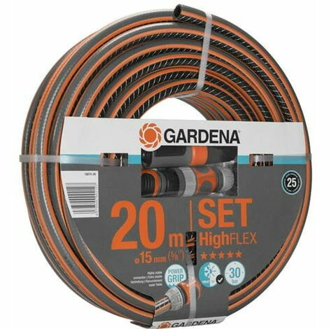Contenu du kit : Tuyau d’arrosage Comfort HighFLEX 15 mm 20 m GARDENA + 1 x lance de nettoyage, 1 x raccord Aquastop, 1 x raccord rapide, 1 x nez de robinet, 1 x adaptateur.