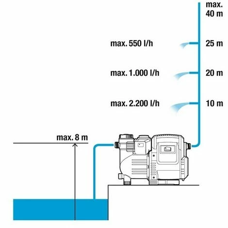 Hauteur manométrique / pression max : 40 m / 4.0 barPression de démarrage : 2.5 +/- 0.2 barHauteur d’auto-amorçage max : 7 mètresTurbine : JetTempérature max du liquide : 35°CCâble d’alimentation : 1.5 m H07 RNF
